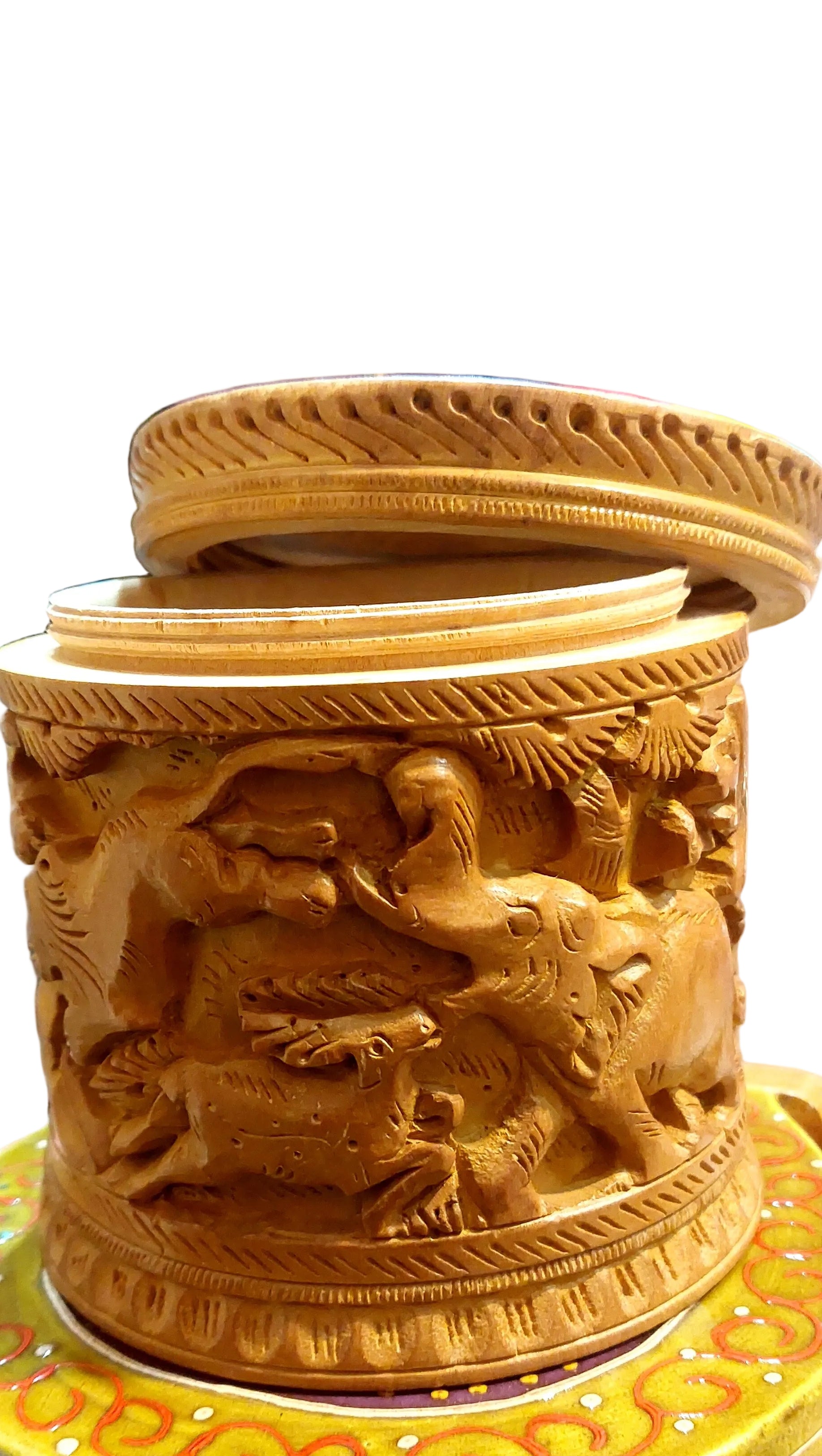 Bring the spirit of the wild into your home with this masterfully crafted 5-inch hand-carved wooden box. Featuring a stunning "Safari" theme, this piece showcases intricate, high-relief carvings of majestic elephants, lions, and graceful deer in a seamless 360-degree landscape.